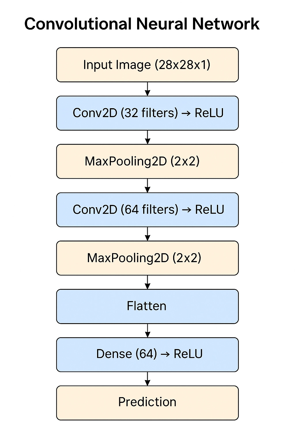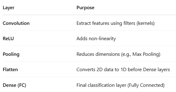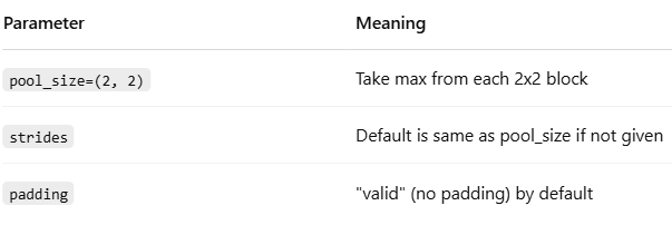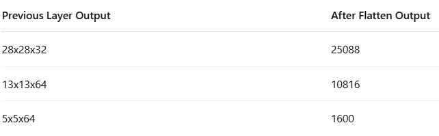 Flatten Layer → Converts multi-dimensional data (output from Conv2D and Pooling layers) into a one-dimensional vector (1D array).