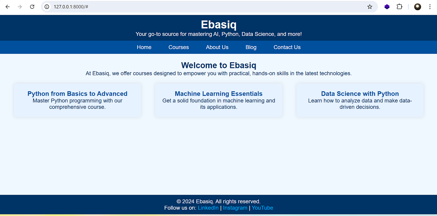 home.html: Insidetemplates, create a file namedhome.htmland paste the following code for the homepage:<!DOCTYPE html> <html lang="en"> <head> <meta charset="UTF-8"> <meta name="viewport" content="width=device-width, initial-scale=1.0"> <title>Ebasiq Home</title> <style> /* Basic styling for layout and elements */ * { margin: 0; padding: 0; box-sizing: border-box; } /* Set the page container to flex with column layout */ body, html { display: flex; flex-direction: column; min-height: 100vh; /* Full viewport height */ font-family: Arial, sans-serif; background-color: #f0f8ff; /* Light blue background */ } /* Header section */ header { background-color: #003366; /* Dark blue */ color: #fff; padding: 10px 20px; text-align: center; } header h1 { margin: 0; } /* Navigation menu */ nav ul { list-style-type: none; margin: 0; padding: 0; display: flex; justify-content: center; background-color: #00509e; /* Medium blue */ } nav ul li { margin: 0 10px; } nav ul li a { color: #fff; text-decoration: none; padding: 10px 15px; display: block; } nav ul li a:hover { background-color: #007bff; /* Light blue for hover effect */ color: #fff; } /* Main content */ .content { flex: 1; /* Pushes footer to the bottom */ padding: 20px; text-align: center; color: #003366; /* Dark blue text for headings */ } .content h2 { color: #003366; } /* Course boxes */ .courses { display: flex; justify-content: space-around; margin-top: 20px; } .course-box { width: 30%; padding: 20px; background-color: #e6f2ff; /* Light blue for course boxes */ border-radius: 8px; box-shadow: 0 0 10px rgba(0,0,0,0.1); color: #003366; } .course-box h3 { margin: 0; color: #00509e; } /* Footer styling */ footer { background-color: #003366; color: #fff; text-align: center; padding: 10px 20px; } footer a { color: #00aaff; /* Lighter blue for links */ text-decoration: none; } footer a:hover { color: #fff; } </style> </head> <body> <!-- Header with brand name --> <header> <h1>Ebasiq</h1> <p>Your go-to source for mastering AI, Python, Data Science, and more!</p> </header> <!-- Navigation menu --> <nav> <ul> <li><a href="#">Home</a></li> <li><a href="#">Courses</a></li> <li><a href="#">About Us</a></li> <li><a href="#">Blog</a></li> <li><a href="#">Contact Us</a></li> </ul> </nav> <!-- Main content area --> <div class="content"> <h2>Welcome to Ebasiq</h2> <p>At Ebasiq, we offer courses designed to empower you with practical, hands-on skills in the latest technologies.</p> <!-- Course section with three boxes --> <div class="courses"> <div class="course-box"> <h3>Python from Basics to Advanced</h3> <p>Master Python programming with our comprehensive course.</p> </div> <div class="course-box"> <h3>Machine Learning Essentials</h3> <p>Get a solid foundation in machine learning and its applications.</p> </div> <div class="course-box"> <h3>Data Science with Python</h3> <p>Learn how to analyze data and make data-driven decisions.</p> </div> </div> </div> <!-- Sticky footer --> <footer> <p>© 2024 Ebasiq. All rights reserved.</p> <p>Follow us on: <a href="#">LinkedIn</a> | <a href="https://www.instagram.com/ebasiq">Instagram</a> | <a href="https://www.youtube.com/@ebasiq153">YouTube</a> </p> </footer> </body> </html>