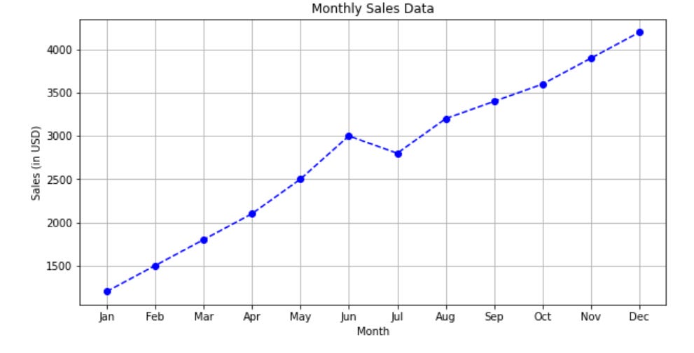 Pandas DataFrame: Sales Jan 1200 Feb 1500 Mar 1800 Apr 2100 May 2500 Jun 3000 Jul 2800 Aug 3200 Sep 3400 Oct 3600 Nov 3900 Dec 4200